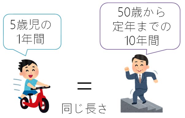 これは時間の感覚が年齢とともにどんどん短く感じていくという現象?といったら良いのかわかりませんが、そうなっていきます。